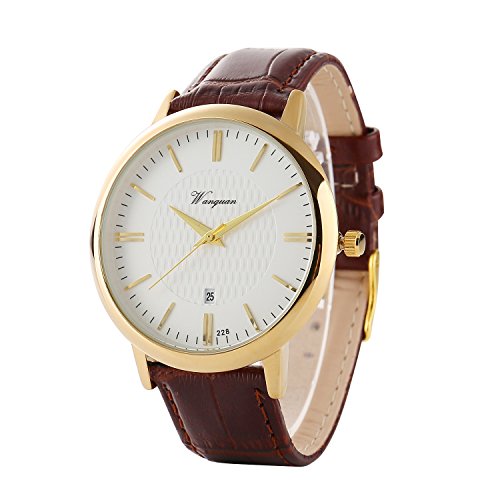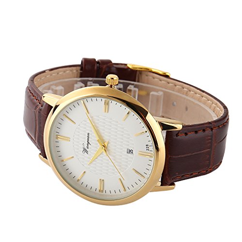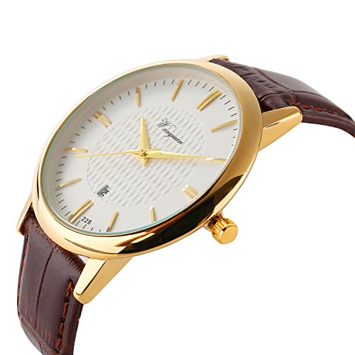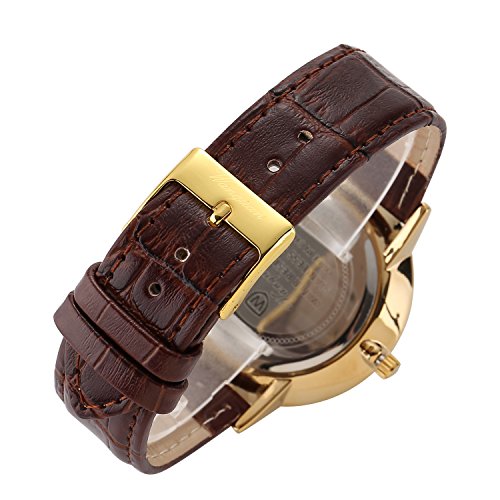 CLASSIC CASUAL DESIGN:IP Plating watch case, calfskin genuine leather watchband, solid stainless steel back cover, long-time life Japanese battery, Analog dress watch casual design, leather band, 3D scale time mark with the simplicity of business casual, bring you back to the classic. Also make it a great gift for family or friends.