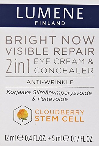 -. Binding : Misc. -. Brand : Lumene -. EAN : 6412600802931 -. Feature : Lumene Bright Now Visible Repair 2 in 1 Eye Cream and Concealer, 0.57 Fluid Ounce, (Pack of 2) / The eye cream moisturizes and reduces wrinkles and delays the formation of new ones •It also protects against the harmful effects of free radicals •The concealer provides instant brightening and helps to cover dark under-eye circles •Unique cloudberry stem cell technology helps to smooth out the skin and reduce wrinkles by protecting and maintaining the skin's own stem cell activity and by boosting its natural hyaluronic acid production -. MPN : B01BPUARPG -. PackageQuantity : 2 -. PartNumber : B01BPUARPG -. ProductGroup : Beauty -. ProductTypeName : BEAUTY -. Title : Lumene Bright Now Visible Repair 2 in 1 Eye Cream and Concealer, 0.57 Fluid Ounce, (Pack of 2)