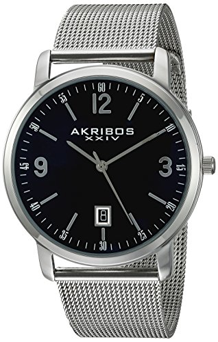 -. Binding : Watch -. Brand : Akribos XXIV -. Color : Silver/Black -. Department : mens -. EAN : 0848572071666 -. Feature : Black radiant sunburst dial with three hand movement and date display window at 6 o'clock position / Individually hand applied silver tone hour markers with baton style silver tone hour and minute hands / Polished silver tone alloy case with fine stainless steel mesh bracelet and EZ adjust sliding buckle / Quartz movement with analog display / Water-resistant to 30 M (100 feet) -. Label : TWI Watches, LLC -. Manufacturer : TWI Watches, LLC -. Model : AK858SSB -. MPN : AK858SSB -. PartNumber : AK858SSB -. ProductGroup : Watch -. ProductTypeName : WATCH -. Publisher : TWI Watches, LLC -. Studio : TWI Watches, LLC -. Title : Akribos XXIV Men's AK858SSB Round Black Dial Three Hand Quartz Bracelet Watch -. UPC : 848572071666