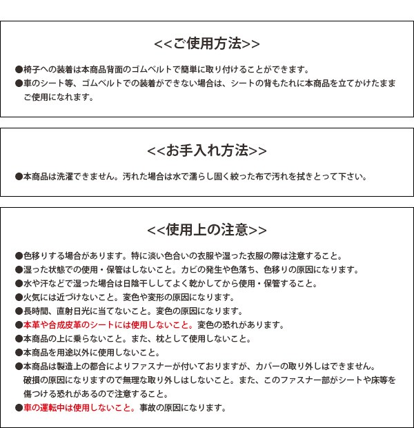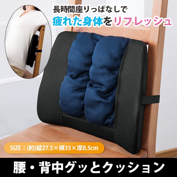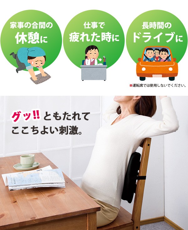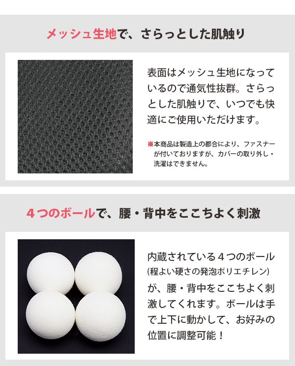 | 表面はメッシュ生地で通気性が良く、さらっとした肌触りです。内蔵されたボールを手で上下に動かして、お好みの位置に調整することが出来ます。家事の合間の休憩や仕事で疲れた時、長時間のドライブ時の助手席や後部座席での使用に。背もたれの硬い木製の椅子に装着するのもオススメです。 |
