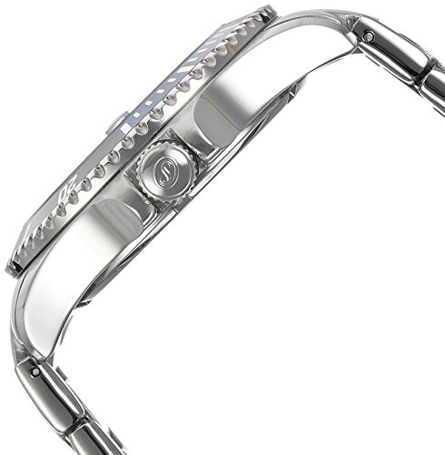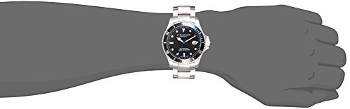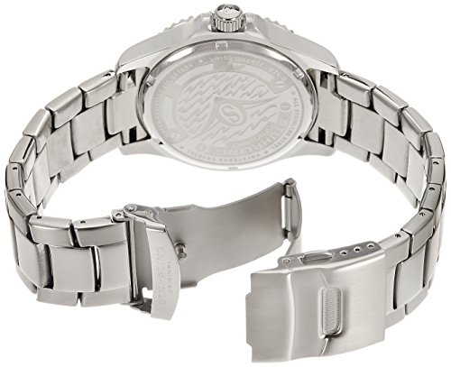 Black dial with applied circular and baton indices and date window at three o' clock position