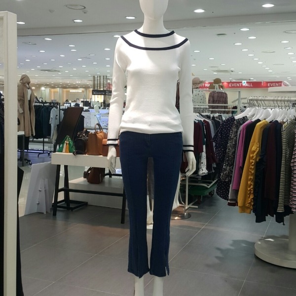깔끔한 니트에 색깔이 배색된 오프숄더형 니트티셔츠입니다