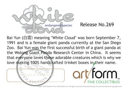 -. Binding : Misc. -. Brand : Objet d' Art -. EAN : 0890829001650 -. Feature : Made 100% by hand by expert metal handcrafters. / Beautifully boxed and includes certificate of authenticity, presentation gift card with matching envelope. / A beautiful, tasteful collectible. A gift worth giving and keeping for a lifetime. / Hand applied authentic Austrian crystal and European lacquers. / Part of the huge collection of jeweled trinket boxes from Artform Fine Collectibles. -. IsAdultProduct : 0 -. ItemPartNumber : AFOA10059 -. Label : Artform, LLC -. Manufacturer : Artform, LLC -. Model : AFOA10059 -. MPN : AFOA10059 -. PackageQuantity : 1 -. PartNumber : AFOA10059 -. ProductGroup : Home -. ProductTypeName : HOME -. Publisher : Artform, LLC -. Studio : Artform, LLC -. Title : Objet D'Art Release #269 "White Cloud" Endangered Panda Bear Handmade Jeweled Enameled Metal Trinket Box -. UPC : 890829001650 -. Warranty : 90 day warranty against manufacturer defects