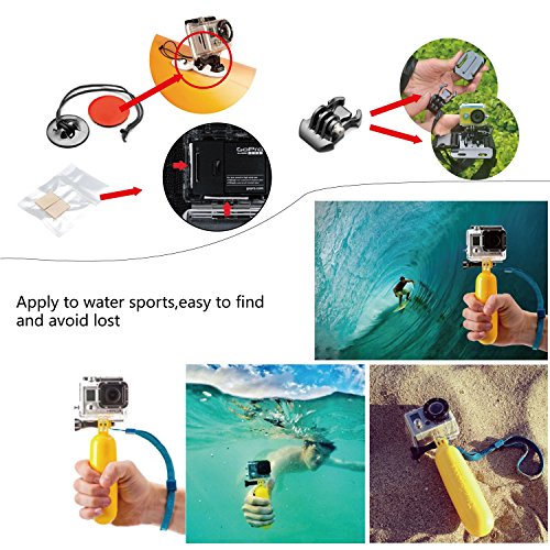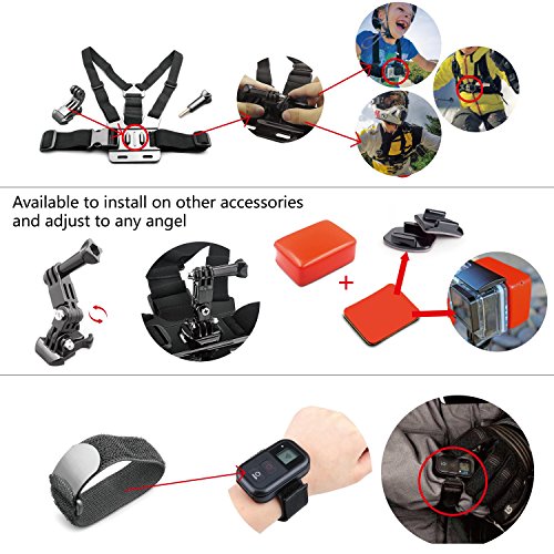 Feature : Chest Belt Strap Mount,Comfortable, fully-adjustable design fits all shapes and sizes of GoPro. The length of the Strap can be adjusted to a suitable size for you. / Floating handle grip is designed to keep your camera with a waterproof shell (not included)easy to float on the water. Bright yellow in the water and can easily be found. Anti-fog Insert at both sides of protective housing, protects camera lens from fog; Suitable for diving, climbing, surfing and aerial photographing The tethers attach to the backdoor of camera housing and the adhesive anchors attach to your gear. A must-have accessory for water sports,Mountaineering, camping and other sports / WiFi Remote Velcro Belt Band Wrist Strap:Long enough to fit around bulky ski coats or just around your wrist comfortably.Attach your WiFi Remote to your wrist, arm, bike handle, steering wheel. / Package will include a durable and stylish kit bag. Which will allowed you to carry all the accessories at ones. It's a brand new affordable all in one kit accessories for action camera in the market today. / Wrist Strap Mount. By adjusting the three-way adjustable pivot arm, you can adjust your gopro camera to any angles through the combination. Then, you will not miss any good pictures due to the angle of your camera.