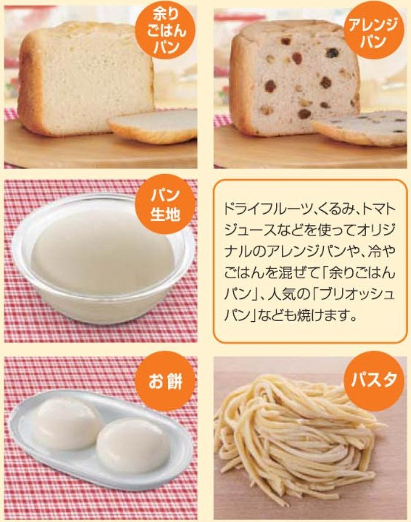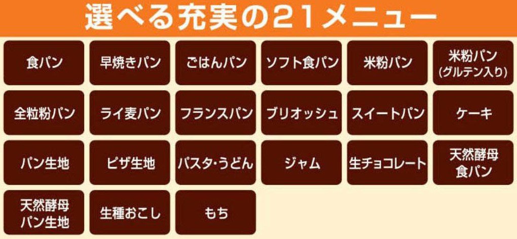 Menu: bread, quick bread, rice bread, soft bread, rice flour bread (with gluten), rice flour bread, whole wheat bread, rye bread, French bread, brioche, sweetpan, cake, dough, pizza fabric, pasta, udon, jam