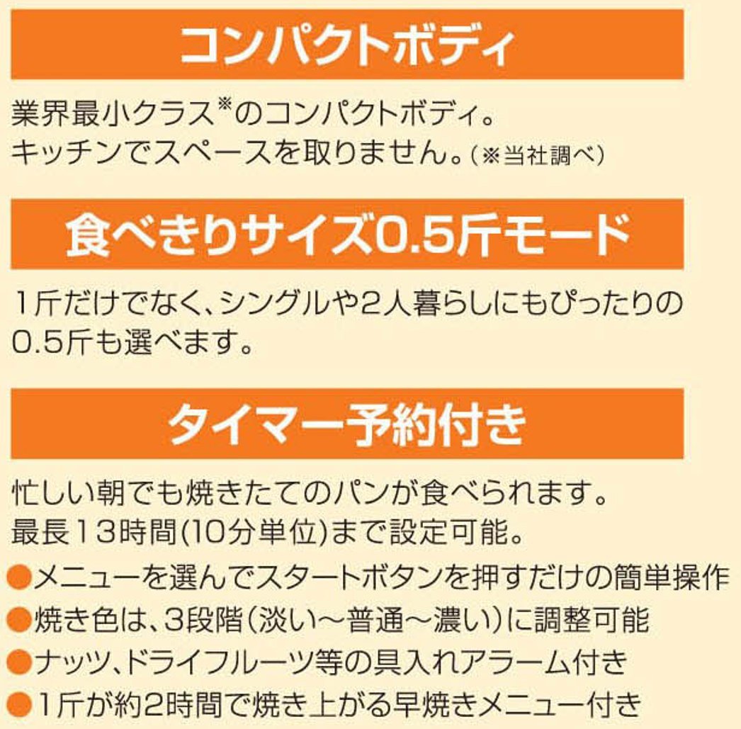 With a timer reservation that can be set up to 13 hours (10 minutes increments), you can eat freshly baked bread even on a busy morning