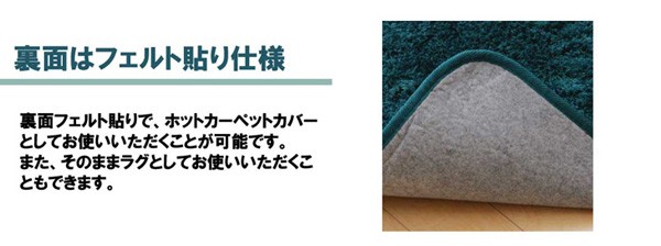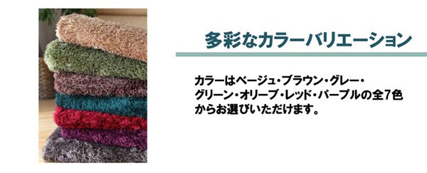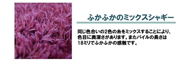 深くモダンな色合いの7色展開です。お部屋に合わせてお好きな色をお選び下さい。同じ色合いの2色の糸をミックスすることで、深い色合いを出しました。パイルの長さが18mmでふかふかな感触のミックスシャギーラグです。電気カーペットカバーとしても使用できます。フローリングを傷つけにくいよう裏には不織布を貼っています。