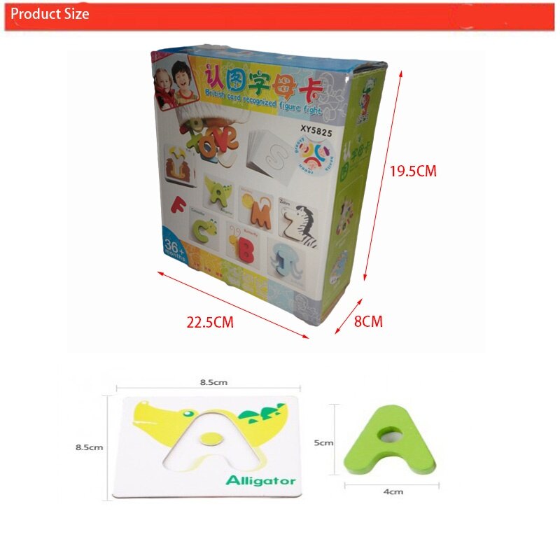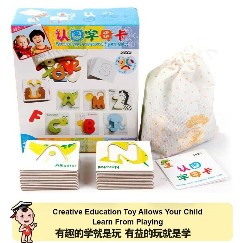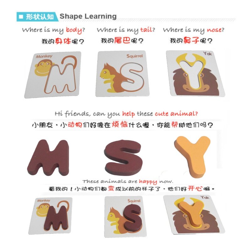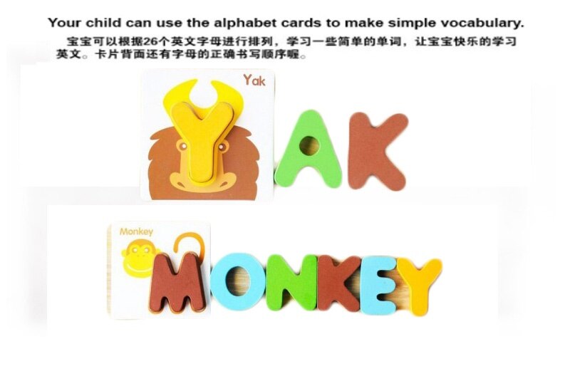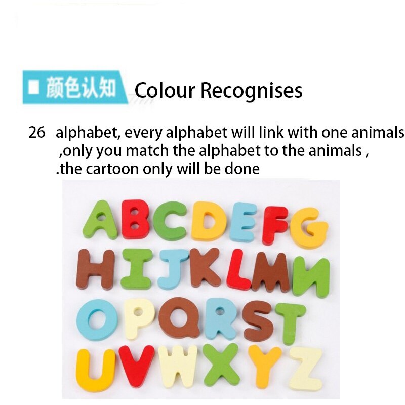 说明:26个木制字母和26个印有可爱卡通动物木卡