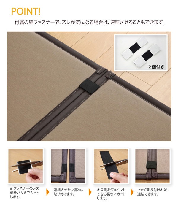 届いたユニット畳を床に置くだけで和のスペースが出来上がります。表生地には国産(九州産)のい草を使用しています。い草には空気の自然浄化作用、湿度の調節作用などがあります。また汚れにくく、使用するうちに黄金色に変化し、味が出ます。中材には10mmの硬わたを使用し、裏地には滑りにくいウレタンフォームを使用しています。青森ヒバに含まれるヒノキチオールは天然の物質としてきわめて抗菌力が強い成分です(抗菌、防臭効果)。また軽量タイプなので、持ち運び、設置、片づけなども楽にできます。連結用綿ファスナーを使用すれば、お部屋に合わせて簡単に何枚でもつなげることが出来ます。
