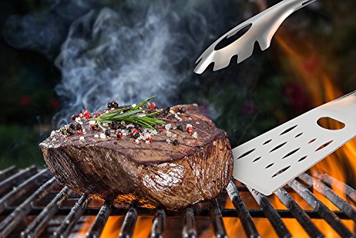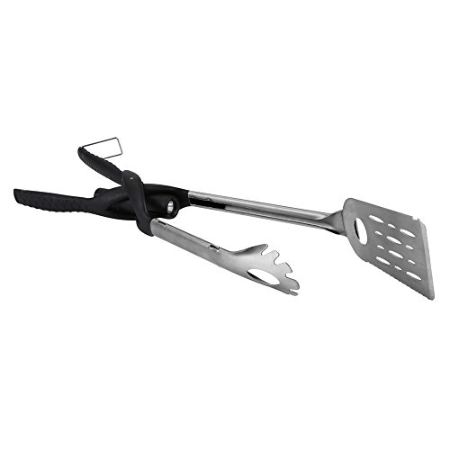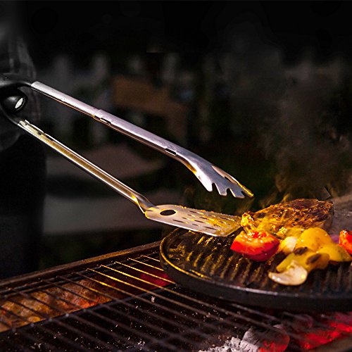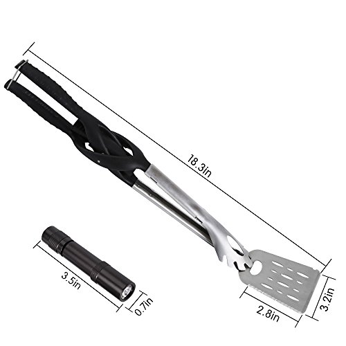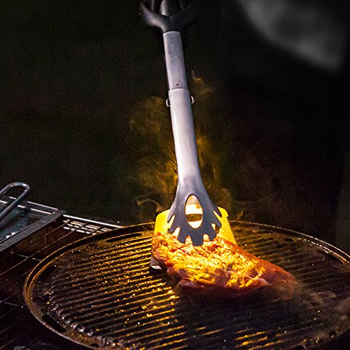 Enjoy your next barbecue be the King of the Grill Kitchendao Grill Pro Multi-Function Spatula Tongs: - Made from durable, rust resistant heavy duty stainless steel - Ergonomic fibre reinforced nylon handle with lock mechanism - Long handle design to ensure hands are safe from heat of the grill - Spatula / Grilling turner with low profile angled edge to easily handle large cuts of meat - Serrated knife edge on spatula for easy cutting - Scraper slot allows quick easy cleaning of grill grates - Fully extending tongs that lock into place - Integrated bottle cap opener - Removable LED flashlight for grilling at night ( 1 AA battery is INCLUDED) - Easy to clean by hand or dishwasher - Makes a great gift for your friends family, especially for those who have a passion for barbecues grilling World Famous Warranty:At Kitchendao, we believe in our products. That's why we back them all with an 36-month warranty and provide friendly, easy-to-reach support. 0