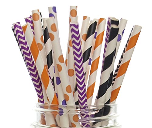 Halloween Straws (25 Pack) - Orange, Black & Purple Chevron, Stripe, Polka Dot October Trick or Treat Party Paper Straws