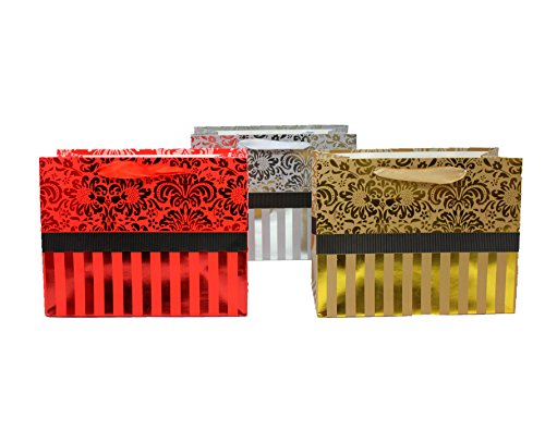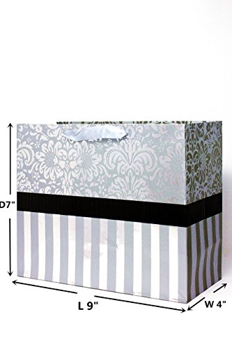 Dimensions: 9"L X 7"W X 4"D Order comes in packs of 12 Colors: Gold, Silver, Red ? Dazzling foil flower designs that gives your gifts a premium shine ? Includes soft, sturdy satin handles ? Eco-friendly, water-resistant and heavy-duty, with reinforced base; can hold up to 13 lbs. ? For business and daily use ? Perfect size for glasses, jewelry, fashion accessories and other small items ? Order comes in packs of 12 0 |