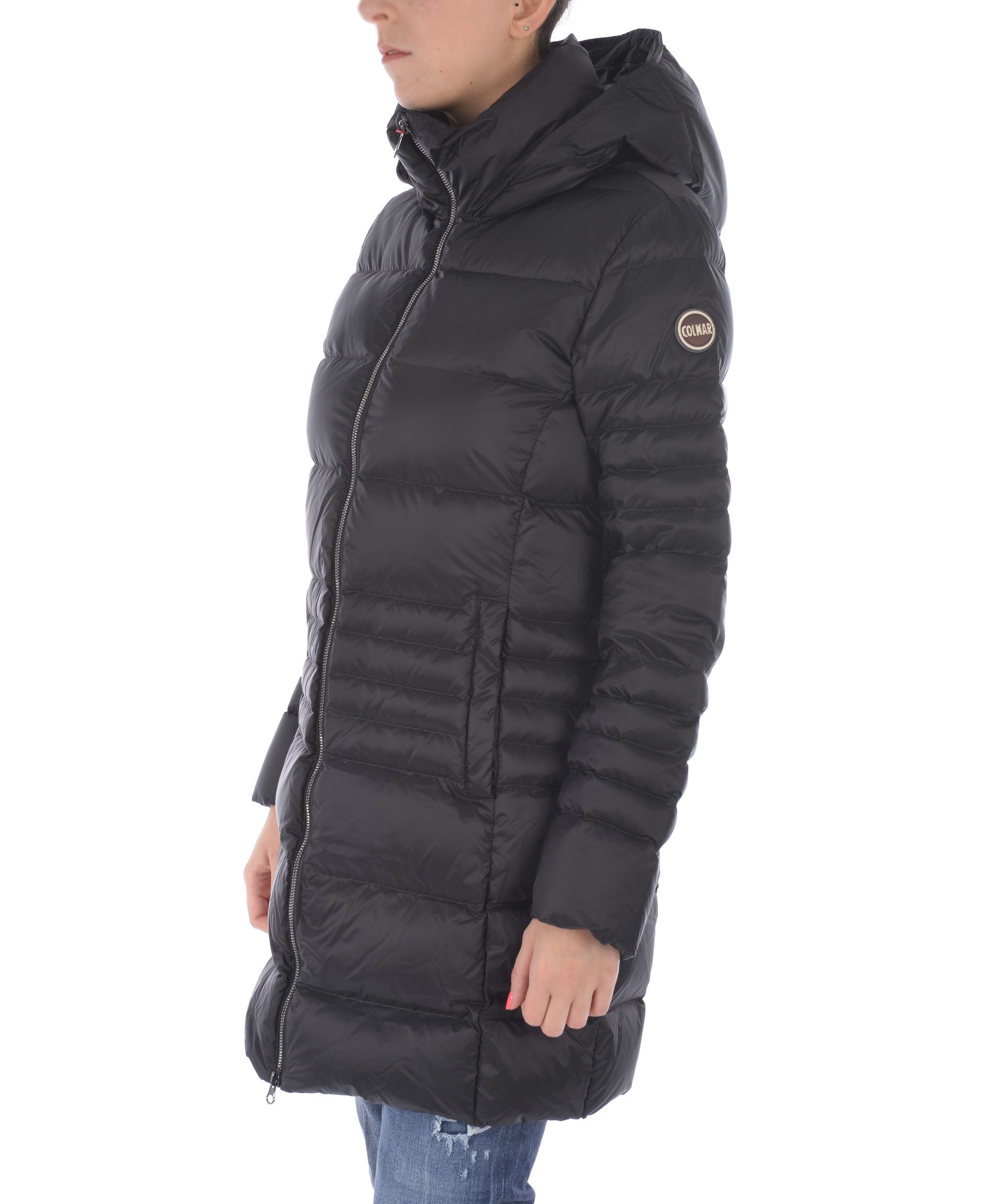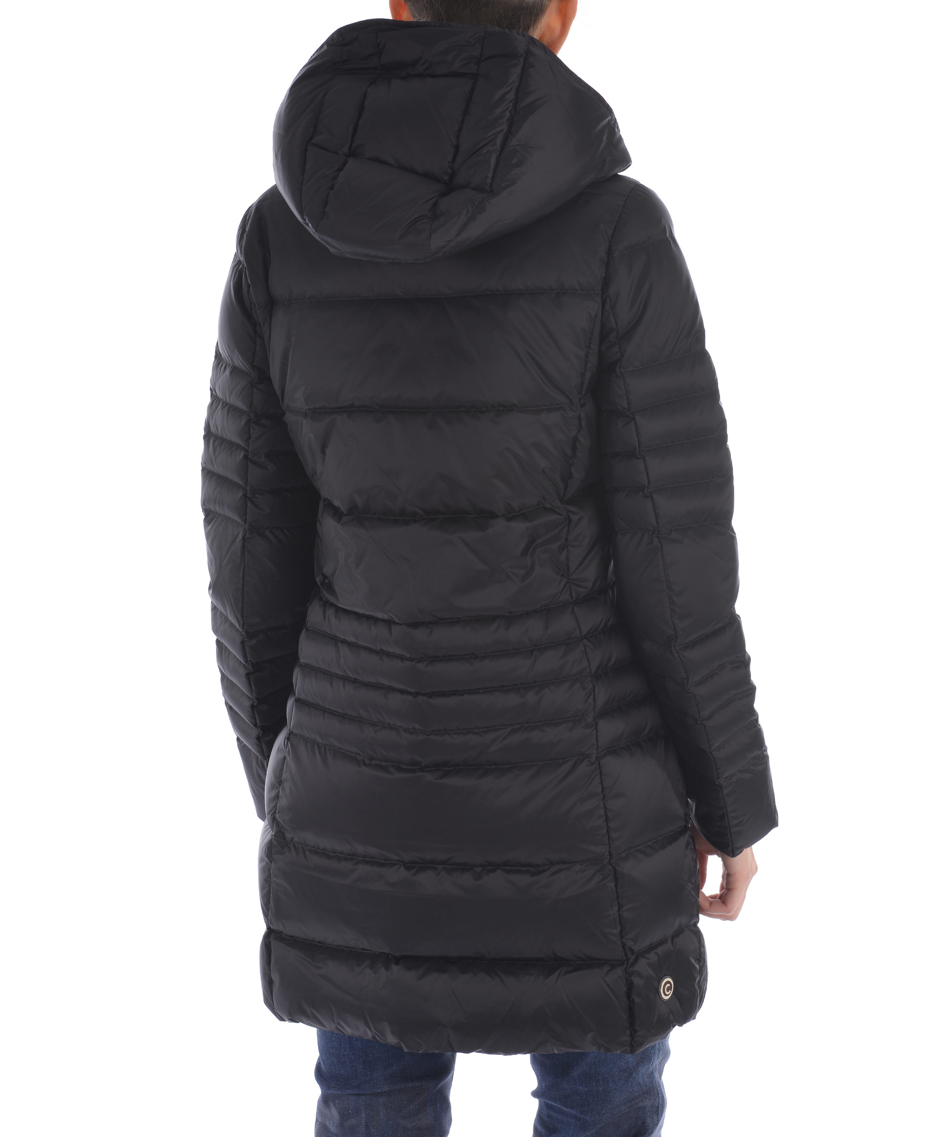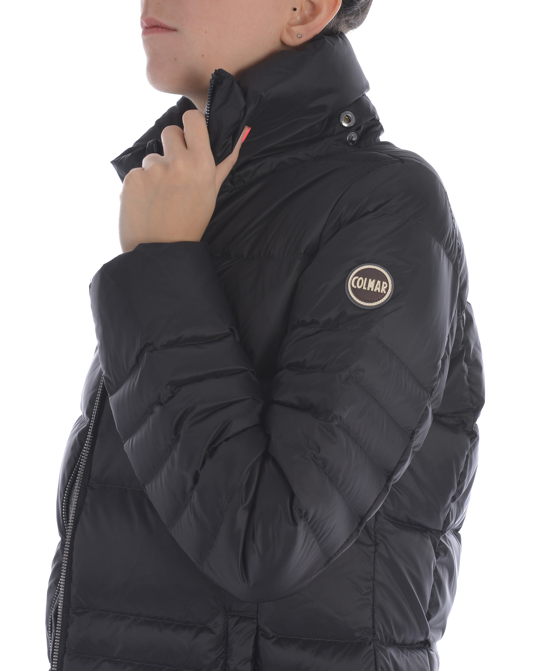 Piumino lungo Colmar Originals in nylon satinato trapuntato Nero. Imbottito in piuma d'oca. Cappuccio imbottito removibile. Collo alto imbottito. Chiusura frontale con zip doppio cursore. Tasche frontali con zip. Logo in gomma applicato sul retro e sulla manica sinistra.