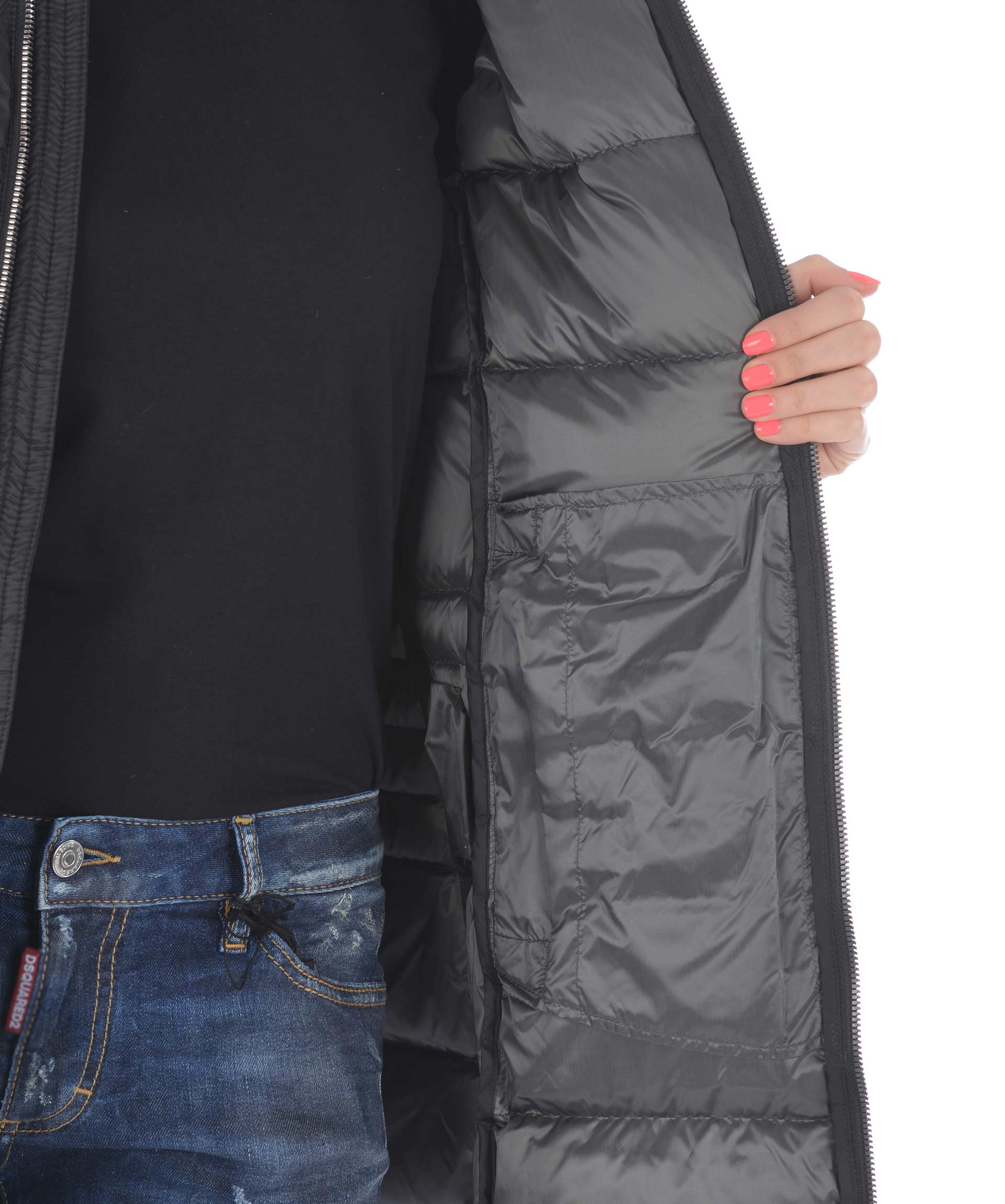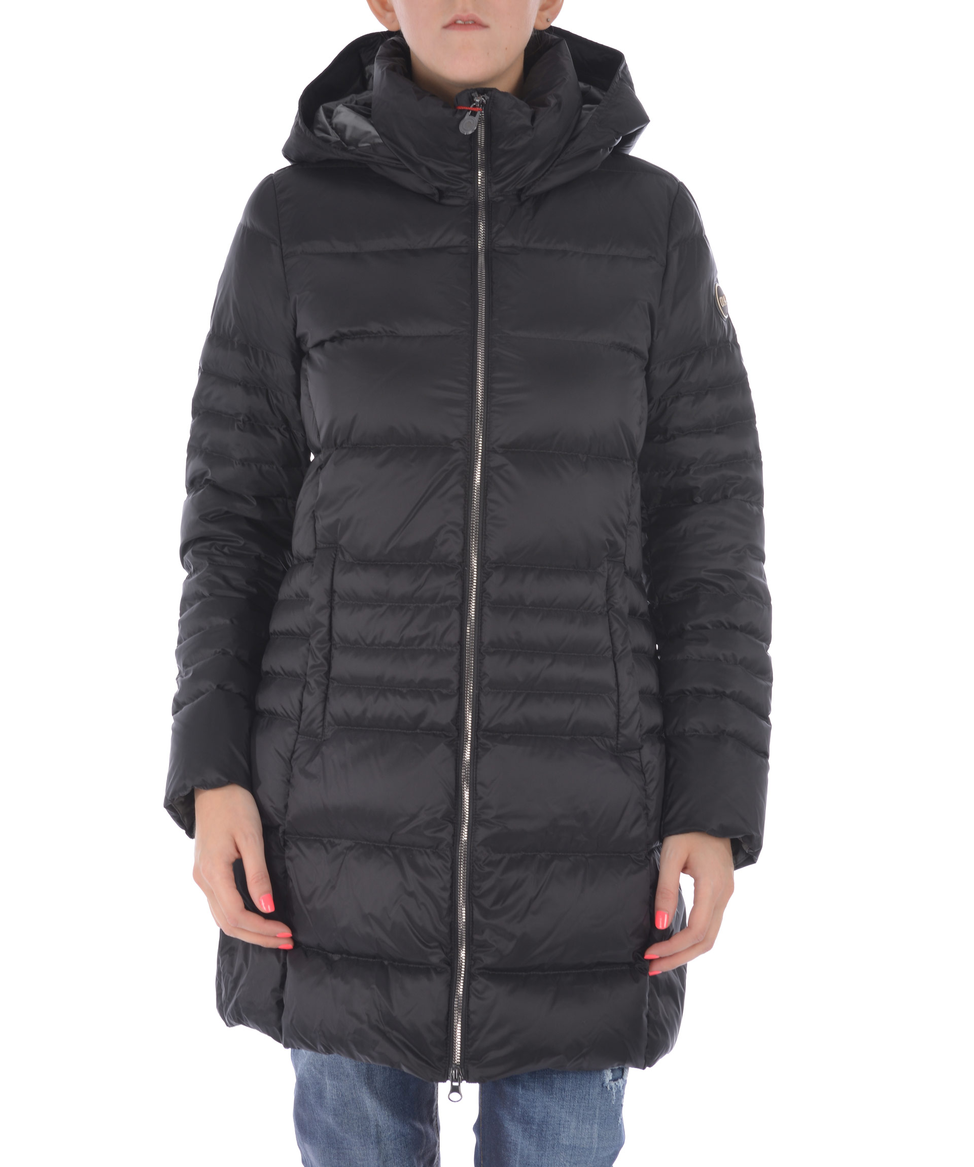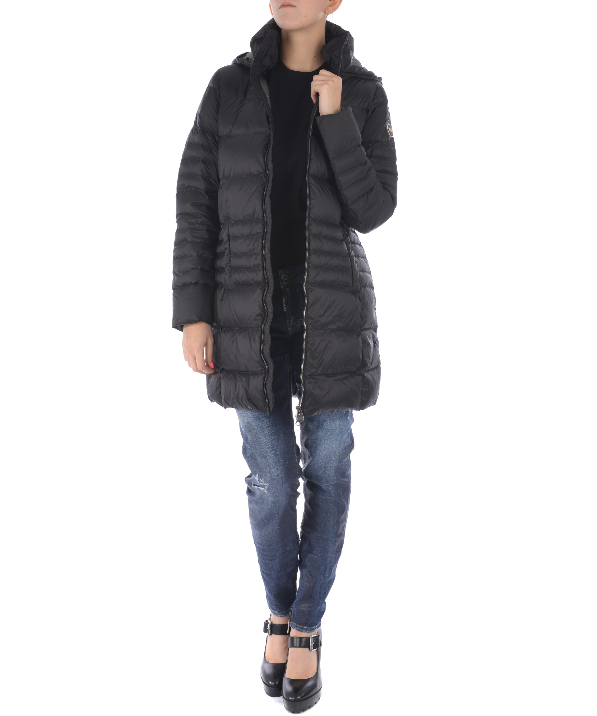 Piumino lungo Colmar Originals in nylon satinato trapuntato Nero. Imbottito in piuma d'oca. Cappuccio imbottito removibile. Collo alto imbottito. Chiusura frontale con zip doppio cursore. Tasche frontali con zip. Logo in gomma applicato sul retro e sulla manica sinistra.