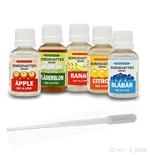 -. Feature : 5 verschiedene 32 ml Aromen + plus eine Pipette gratis. / Gibt Sprudelwasser einen leckeren Duft und milden Geschmack. / Keine künstlichen Süssungsmittel, Aromen oder Farbstoffe, ohne Zucker oder Konservierungsmittel. / 2 ml Aroma auf 1 liter sprudelndes wasser. / In Schweden hergestellt - einfach zu handhaben.