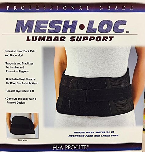 -. Binding : Misc. -. Brand : BSN Jobst -. Color : Black -. Feature : The Mesh-Loc provides abdominal compression and lift to the lumbar region, stabilizing and supporting these areas to relieve lower back pain and discomfort. / The 10" posterior panel covers L1-L5 vertebrae, and the tapered panels contour the body for excellent compression and support. / Mesh is also completely air permeable and is latex free and neoprene free. / Color: Black. -. Label : Florida Orthopedics -. Manufacturer : Florida Orthopedics -. MPN : 31-330SMBLK -. PackageQuantity : 1 -. PartNumber : 31-330SMBLK -. ProductGroup : Sports -. ProductTypeName : SPORTING_GOODS -. Publisher : Florida Orthopedics -. Size : Small -. Studio : Florida Orthopedics -. Title : Florida Orthopedics Mesh-Loc Latex Free Lumbar Support 10", For Men or Women, Black