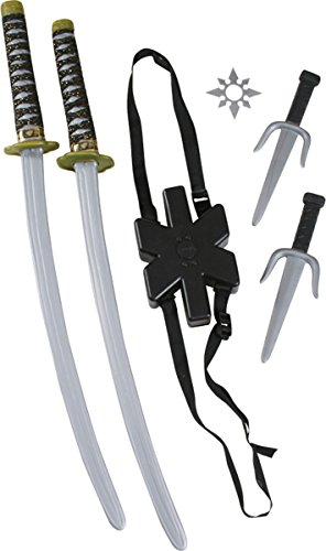 -. Brand : Fun World -. ClothingSize : One Size -. Color : Silver -. Department : unisex-adult -. Feature : Six piece set includes 2 katana / 2 sais, 1 ninja star / 1 backpack for carrying -. Model : FW8276 -. ProductGroup : Apparel -. ProductTypeName : ADULT_COSTUME -. Size : One Size -. Title : Ninja Double Sword Set Costume Accessory Set -. UPC : 643272575663