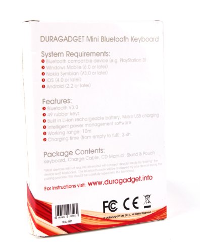 DURAGADGET's new mini bluetooth keyboard gives you the option of an external keyboard for your smartphone, using state of the art wireless technology to connect to your device without the need for cables and plugs. The keyboard comes packaged in a sleek DURAGADGET gift-box, making this the perfect Christmas or birthday gift for a tablet, mobile phone or PS3 owner. Typing on the keyboard is much more like using your conventional PC, rather than a screen based keyboard, all in a package that fits in your pocket! The keys are low-profile and designed to give a tactile and responsive feel to your typing needs; this is the ideal accessory for your smartphone if you dislike typing on a small and fiddly touchscreen keyboard. The mini bluetooth keyboard has a built-in charger for its long-life Li-ion battery, which can be connected through a micro-usb port (cable included).