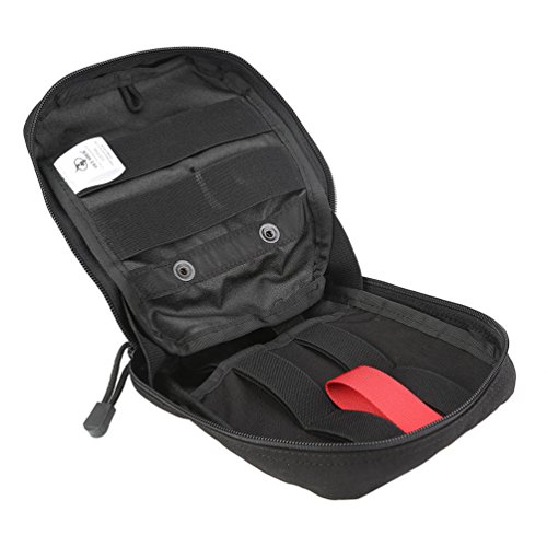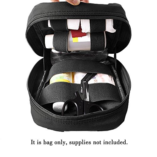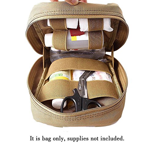 -. Feature : Durable and Tough: This tactical first aid pouch is made of military grade 500D nylon with sturdy double stitching, long-lasting performance guarantee / Molle system: Utility straps with strong copper lined snaps allow you to attach this medical pouches to any molle compatible gear(to be worn on belt, vest or backpack) / High quality 2-way SBS zippers with pulls that will open all the way flat, so it won't shut suddenly while you are trying to access first aid supplies / Great Organizer: 8''H x 6''W x 3''D IFAK bag with a spacious pocket and elastic straps inside / Suitable for outdoor camping, hiking, emergency, cycling and so on. It is EMT pouch only and empty, didn't include medical supplies