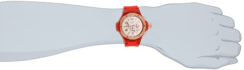 Vibrant watch featuring screw-accented rose gold-tone bezel, trio of chronograph subdials, and date window at 4 o'clock
