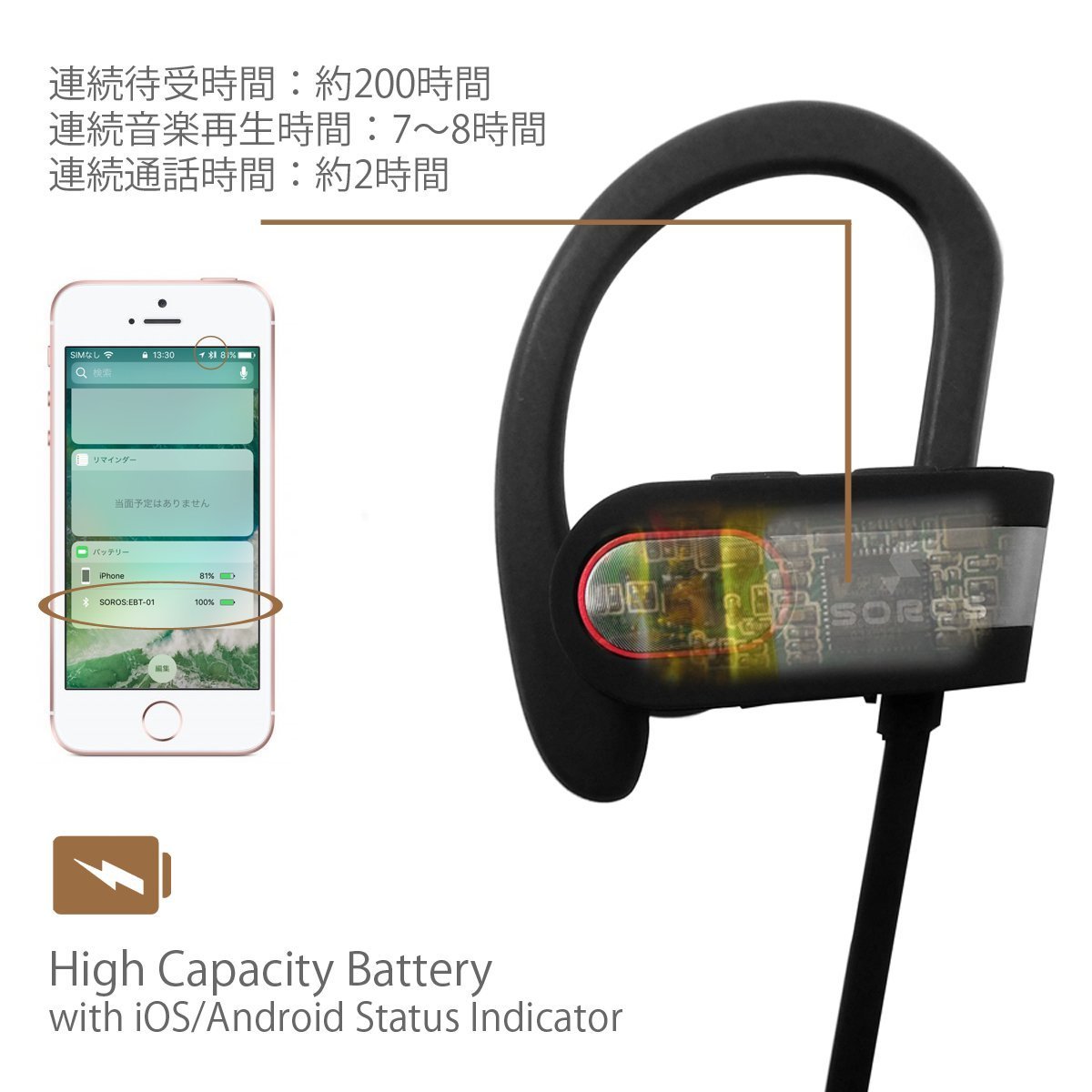 · Ultra light type large capacity battery installed Continuous standby 200 hours continuous music reproduction About 8 hours