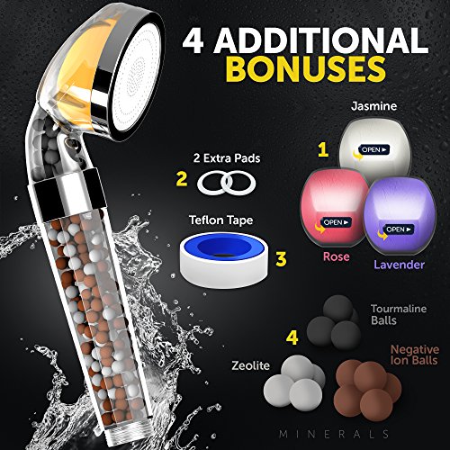 Filtered Shower Head – Shower Filter with 4 Scented replaceable blocks - Shower Water Filter with Mineral Balls - Vitamin C, Lavender, Jasmine & Rose - Removes Chlorine, Fluorine and Odors