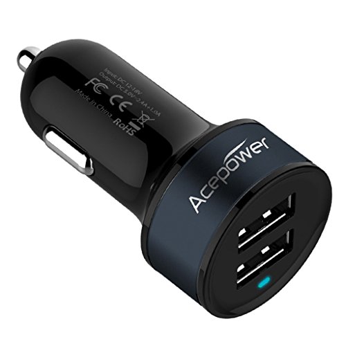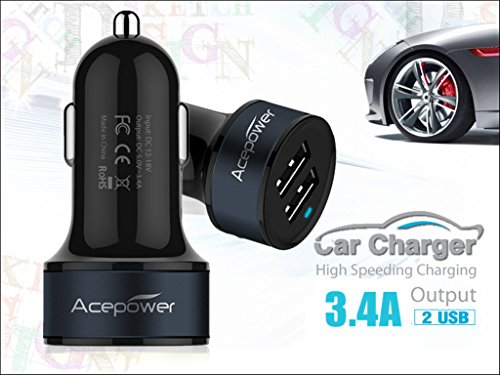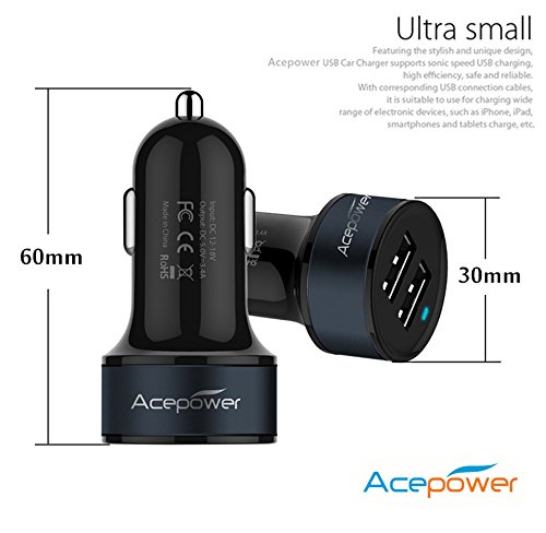 - Feature : The ACEPower Mini Dual USB Universal Car Charger allows you to charge Smartphones, tablets, music players, and electronic devices on the trip, MFI(Made for iPhone iPad iPod)Approved, optimal performance on all Apple product,cable is not included / Two USB ports(2.4A and 1A)offers rapidly charging of smartphones, tablets, and other devices. automatically stops when the device battery is full. A blue LED power indicator is lit to show that the Acepower car charger is ready for use or is charging / Input Voltage: DC 10.5 V-18 V (12 V-18 V Battery), Direct Cigarette Lighter Connection. Output: Min 5.0 V Max 5.3 V, Full Rated 3.4 Amp (2.4 + 1 Amp USB Port) 17 W, Ripple & Noise Max 150 mVp-p. / MFI means that the accessory has been designed to connect specifically to iphone or ipad or ipod,and has been certified by the developer to meet Apple performance standards / Safely protect devices and charger from overheated. LED only light up when charger in good working condition: input voltage is in working range 10.5V-18V, automatically stops working when over current or over voltage is detected, switch to minimal charging current when battery is full. With the high charging efficiency of over 85%, the charger itself never get hot. High quality fire proof material & anti-oxidation aluminum pull tab. No radio loss in your car or effect to Bluetooth or Wi-Fi devices.