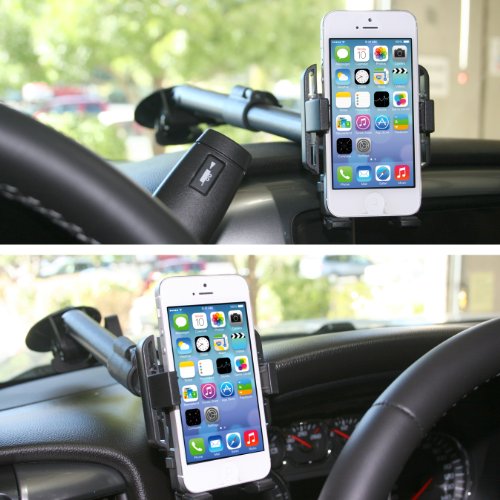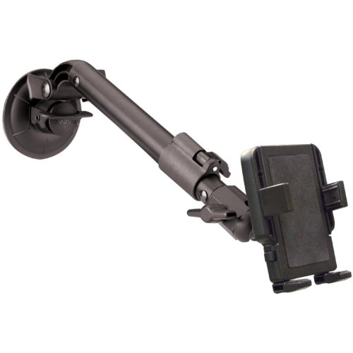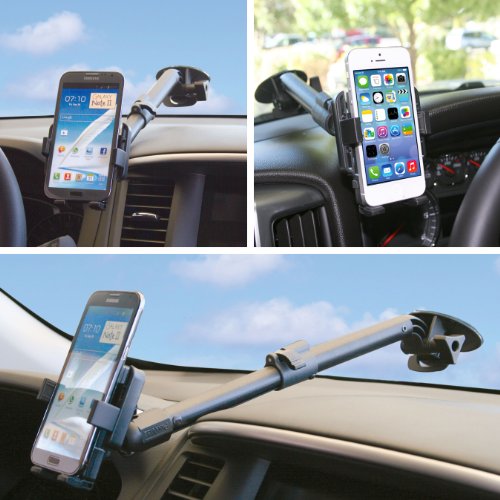 -. Feature : Powerful suction cup mounts to vehicle windshield. Easily move from vehicle to vehicle or stow for security / Mount should be installed at the base of windshield with the shaft resting on dashboard to support against excessive leverage. / Telescoping arm extends up to 18". Perfect for vehicles with deep dashboards such as trucks and . / Fits most phones from 2.25" to 3.75" wide (with or without a case), including the most popular handsets; iPhone 5s, iPhone 6, Samsung Galaxy, Motorola, HTC, LG and even larger phones such as Samsung Galaxy Note 4 and Iphone 6 Plus) / PanaVise Tilt, Turn & Rotate - fully adjustable