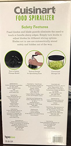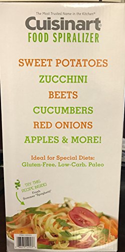 This multifunctional Food Spiralizer is equipped with Cuisinart's exclusive food processor blade technology, which offers home cooks three cutting options: thin or thick julienne, and ribbon slice. The unit's vertical design makes for easy spiraling, and is ideal for making noodles, onion straws, potato chips, fruit chips, and more. Additionally, its Blade Lock design eliminates the need to touch or handle sharp blades, and the entire unit is dishwasher safe.Feature