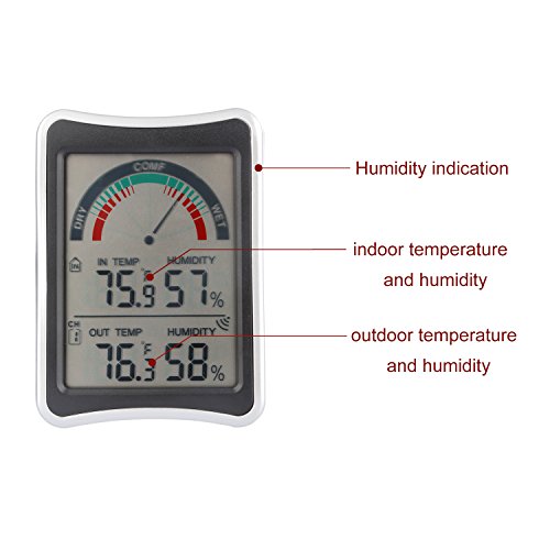 Usage: One part(the main console) is placed indoors, and the other part(outdoor sensor) is placed outdoors, and it uses a wireless transmitter to communicate; Temperature range: -3.8℉ to 158℉(-19.9℃ to 70℃), resolution: 0.1°C. Humidity range: 10%~99% RH, resolution: 1% RH