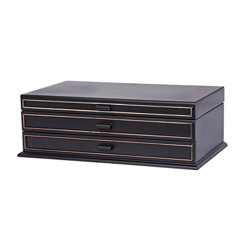 -. Feature : Dimensions: 15L x 8.5W x 5H in. / Wood with raised molding on drawer and lid / Black finish with gold accents / Lift lid with mirror and automatic tray / Hand-lined in ivory suede fabric