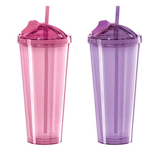 Set of 2 Purple and Pink Oggi Double Walled Tumblers with Slide-Open Straw, 20-Ounce