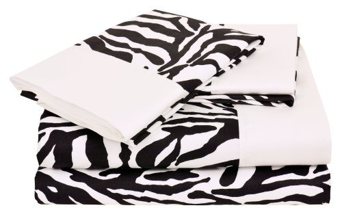 - Wild zebra print will enliven any room; flat sheet and pillowcases with 4-inch white hem separated by black piping