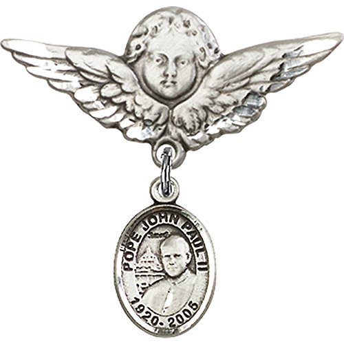 -. Title : Sterling Silver Baby Badge with St. John Paul II Charm and Angel w/Wings Badge Pin 1 1/8 X 1 1/8 inches