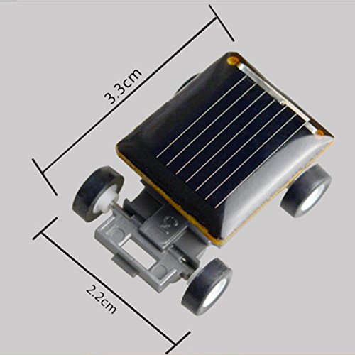 Studio : E-SCENERY Publisher : E-SCENERY Binding : Toy Product Description Product description The Mini Solar Racer is a toy car which claims to be the world's smallest solar powered car. The solar panel allows the car to move from eco-friendly solar energy when the car is placed either in sunlight or under a bright artificial light. The Mini Solar Racer is a helpful toy to demonstrate both the abilities of solar power and the advancements in technology that allow a solar powered car to be made to such a significantly small size. The toy car measures an astonishing 3.3 cm x 2.2 cm x 1.4 cm (1.3 in x 0.87 in x 0.55 in) which does mean its not suitable for children under 3 due to small parts (up to and including itself!). Specification: 1. Solar Powered - No batteries required 2. Solar panel covers the entire roof, and makes this baby fly 3. Excellent for demonstrating solar power in action 4. About the size of a quarter 5. No Battery Require 6. Size:33mm x 22mm x 14mm Package: 1 x Solar Power Energy Mini Car