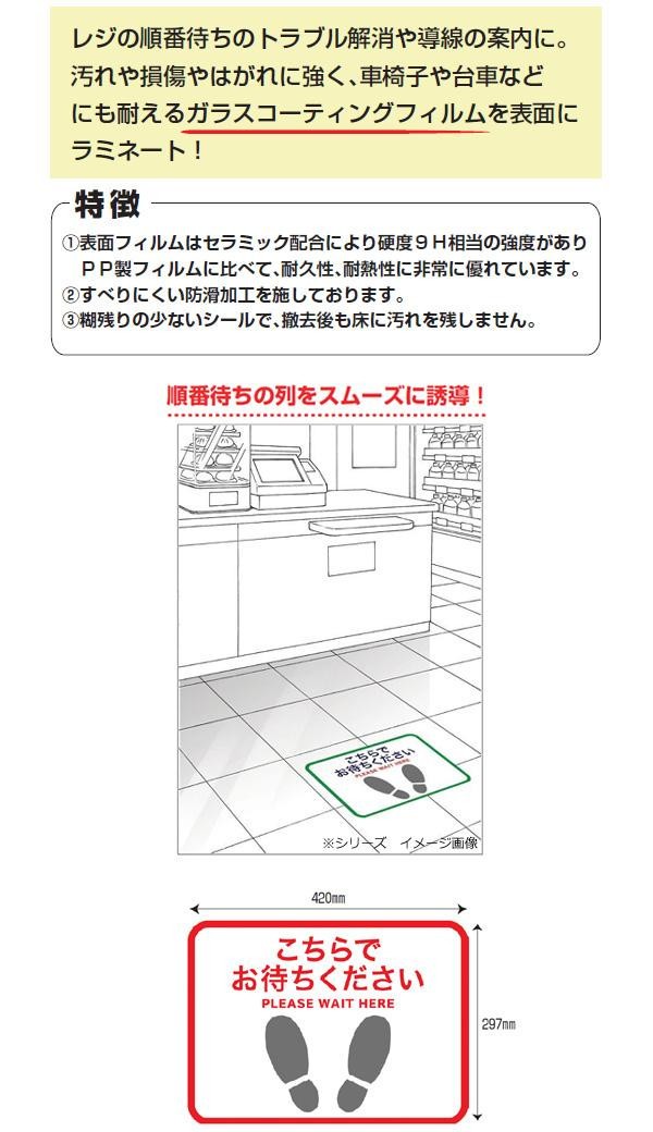 | ガラスコーティングフィルムを表面にラミネートした、耐久性抜群のフロア誘導シールです。コンビニ・ドラッグストアなど、屋内の行列のできるあらゆる場所でお使いいただけます。長期に渡って使用感を感じさせず、店舗の美観を保てます(想定期間は通常使用で約2年の目安)。光沢があるタイプなので、視認性にも優れています。 |