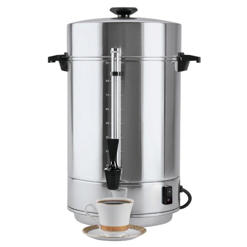 Studio : West Bend Publisher : West Bend Product Description The 58001R 101 cup (3.9 gallon) aluminum coffee urn brews 12-101 cups of coffee and has the ability to brew a cup in less than a minute! The polished aluminum coffee percolator brews perfect coffee, and automatically holds it at the ideal serving temperature. This aluminum coffee pot is economically priced, and is built to brew flavorful coffee day after day. Added features like cool-touch handles and an indicator light tells you when brewing is complete on the West Bend coffee urn. The 58001R has a graduated sight line, indicating how much coffee is inside. This urn is ideal for caterers, restaurants, schools, hospitals, nursing homes, offices and shops. No filters are required. A cleaning tool is included. The 58001R measures in at 14 1/2"L x 12"W x 20 3/4"H. 0