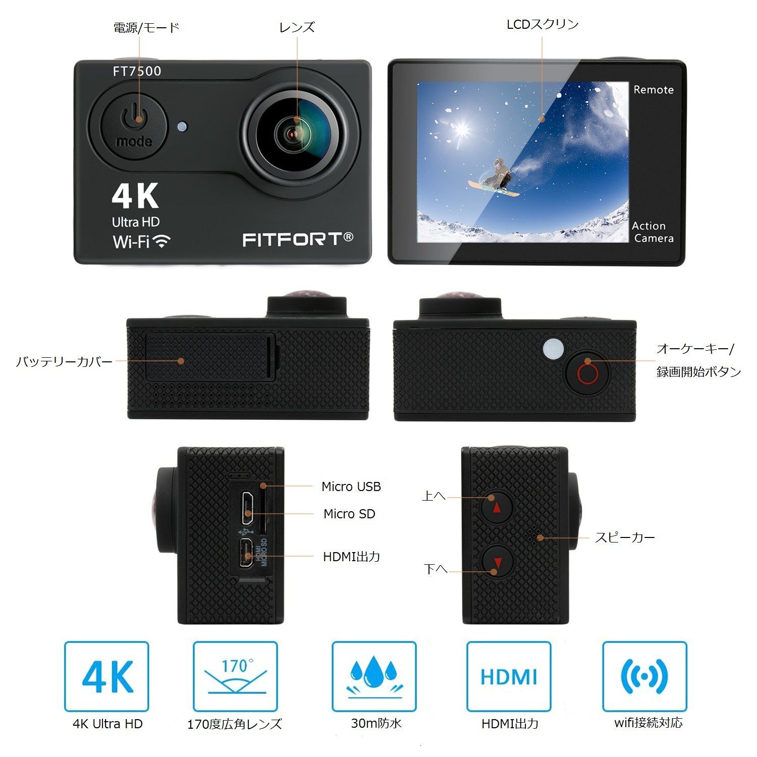 4K · HD · 170 degree wide angle lens · 2 inch HD LCD display, ideal for sports!