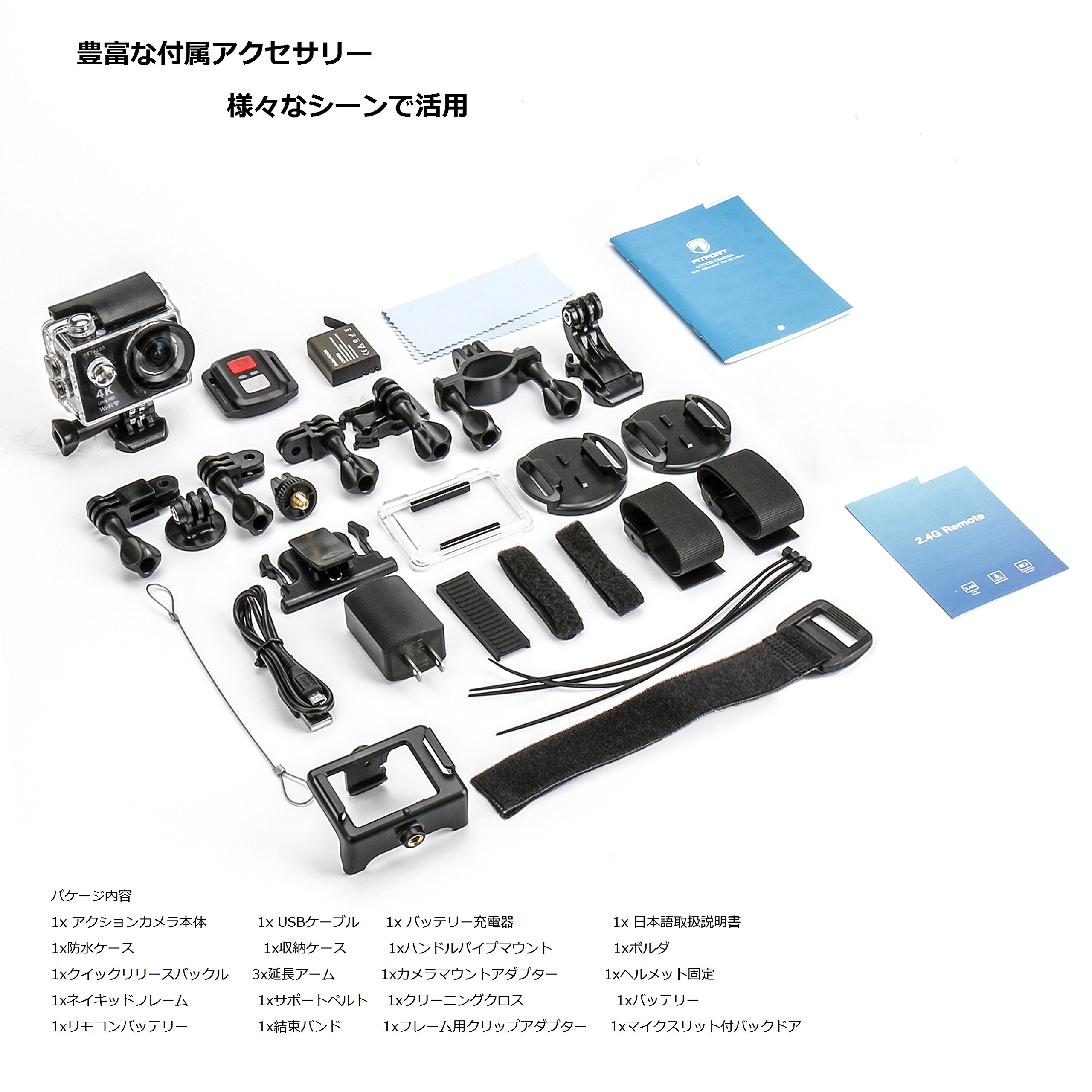 1 x Action Camera Body, 1 x USB Cable, 1 x Battery Charger, 1 x Japanese-English Instruction Manual, 1 x Waterproof Case, 1 x Storage Case, 1 x Boulder, 1 x Handle Pipe Mount, 1 x Quick Release Buckle, 3 x Extension Arm, 1 x Camera