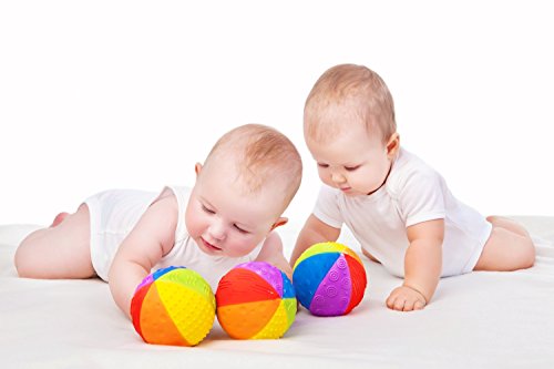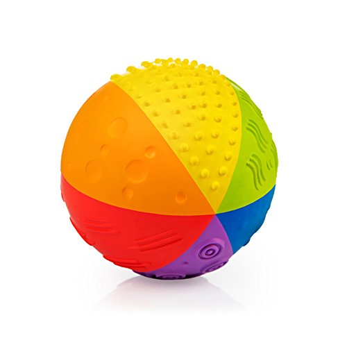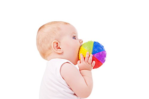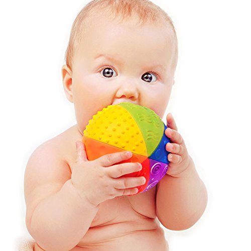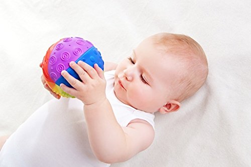 - 6 different textures for tactile exploration; gentle squeaking sound when squeezed