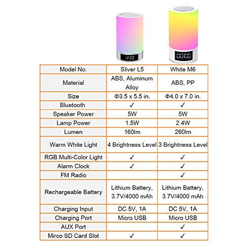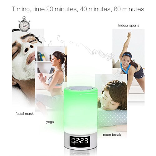 - LED touch table lamp, Bluetooth speaker, FM radio, hand-free phone call, dimmable night light, RGB dynamic ambient light, alarm clock (Military time only), sleeping timer.
