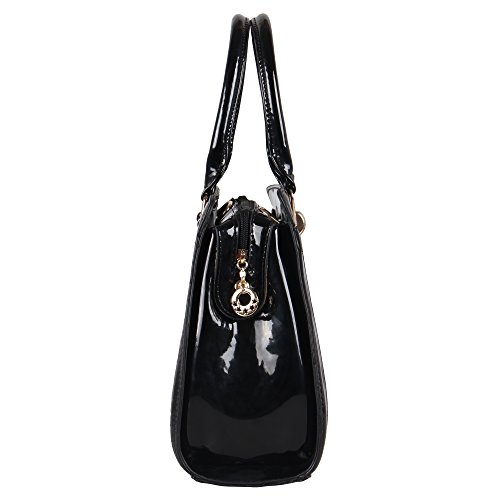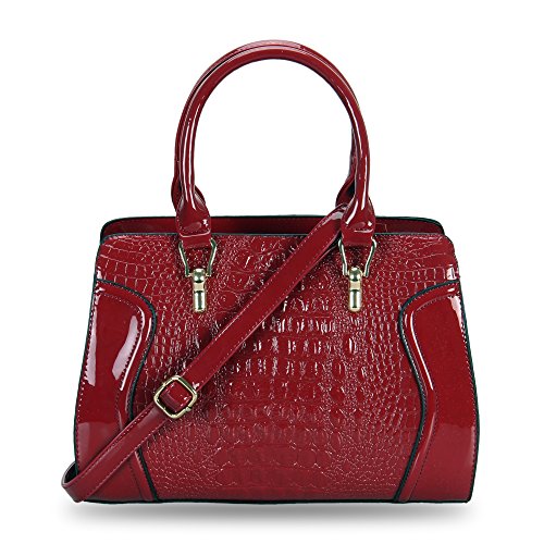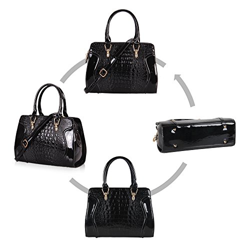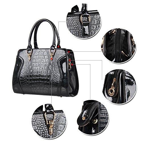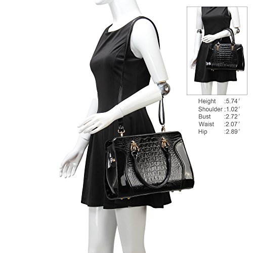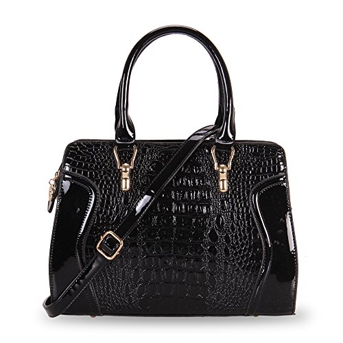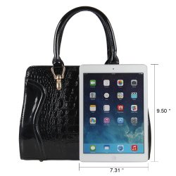 -. Brand : Hynes Victory -. Color : Black -. Department : womens -. Feature : Made of premium synthetic embossed patent leather with fabric lining / Double top handles with 5.5 inches drop; removable and adjustable shoulder strap with 47.2 inches length / Exterior features classic gold tone hardware and 1 top zipper closure / Interior features center zip pocket, 1 zip pocket and 2 slip pockets for better organization / Perfect lady bag to commute and fit any occasions and seasons -. PackageQuantity : 1 -. ProductGroup : Shoes -. ProductTypeName : HANDBAG -. Size : Medium -. Title : Hynes Victory Crocodile Pattern Top Handle Handbags