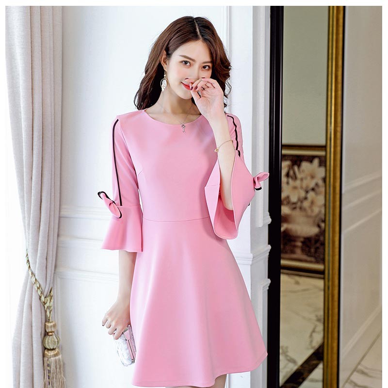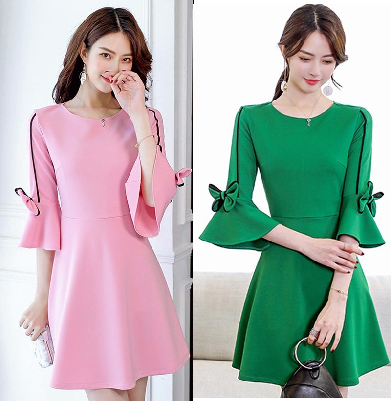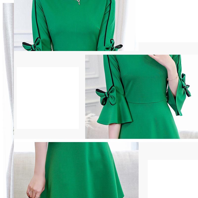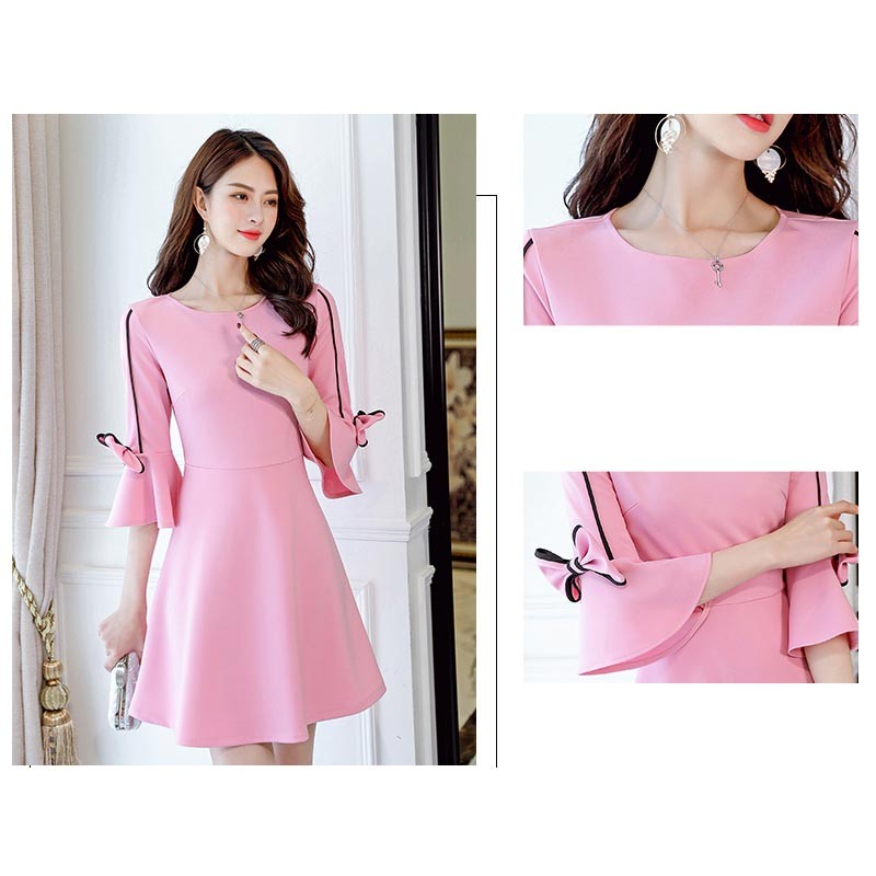 ラウンドネックの七分袖ベルスリープのショート丈ワンピースです!
