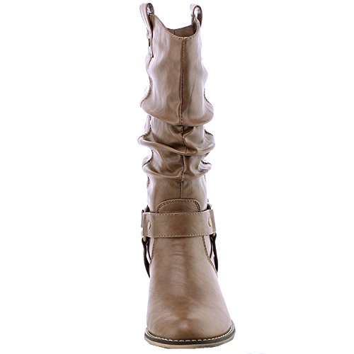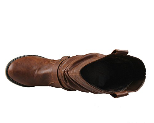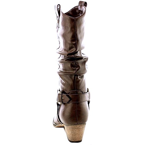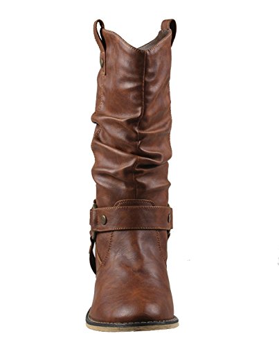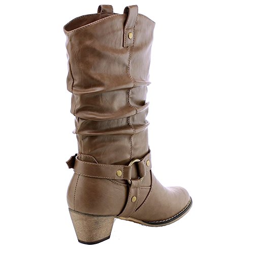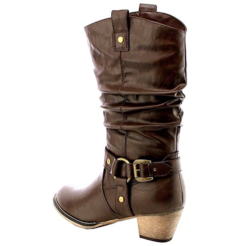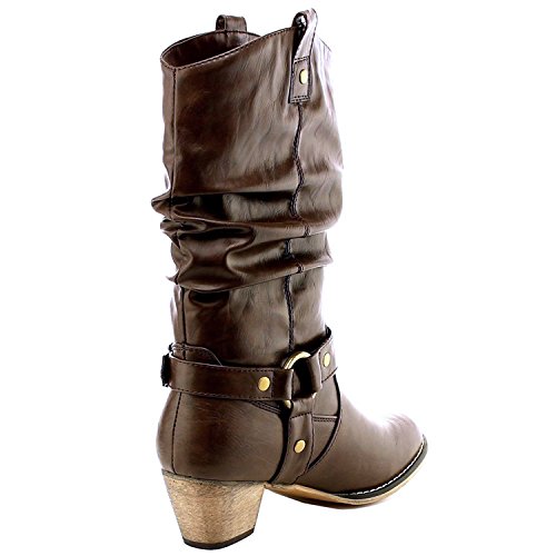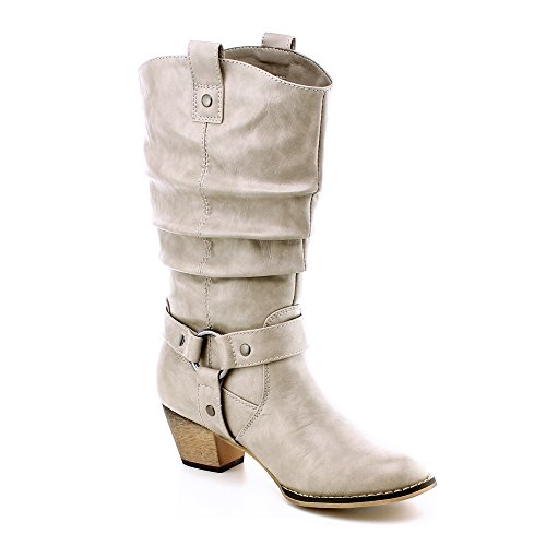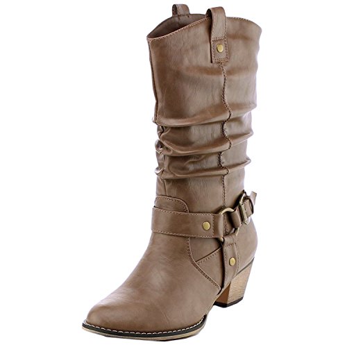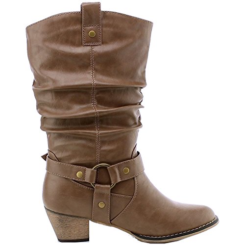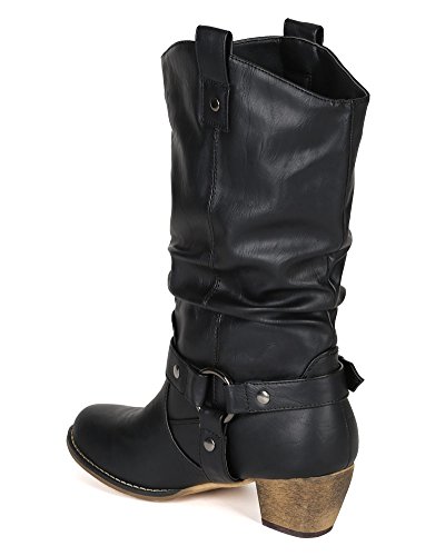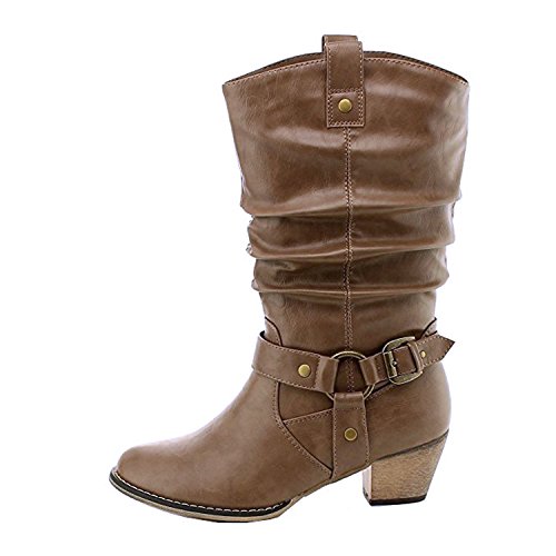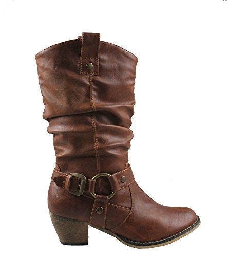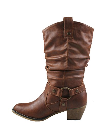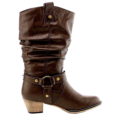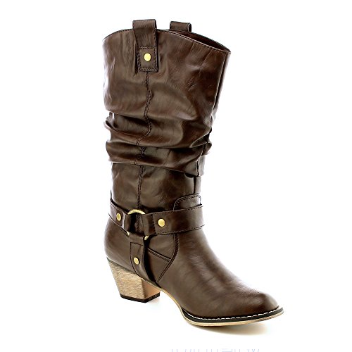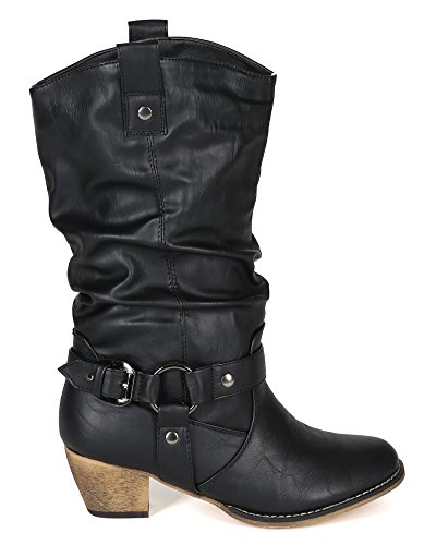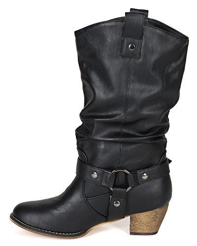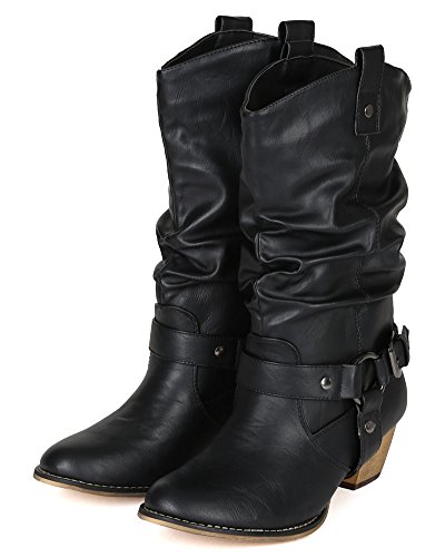 TIMELESS, yet on trend The Wild West look comes alive in the design of these Women's Slouchy Mid-Calf Boots.The boots have a contoured 15-inch opening at the top and an O-ring buckle ankle strap just like classic cowboy boots.For a high fashion finish, the boots feature a stacked 2-inch heel. This design is on trend and reflects the latest styles but will remain hip and fashionable for years to come!