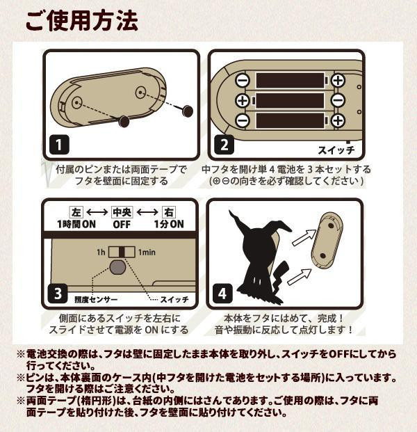 | 仕様 | ●使用電源:単4電池×3本(別売り) ●電池寿命目安:約2000回点灯(1分間点灯、アルカリ電池使用時) ※使用状況・環境により異なる。 ●音や振動に反応して点灯(1分または1時間で自動消灯) ●照度センサー機能付 ●取扱説明書(台紙裏記載) |