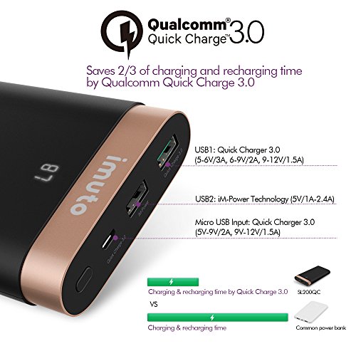 First Portable Charger with Qualcomm Certified Quick Charge 3.0 Technology: Up to 4x faster than standard chargers, able to charge up to 80% of the battery for QC 2.0 / 3.0 compatible devices when charging for approximately 35 minutes.
