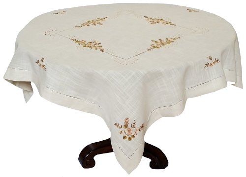 Xia Home Fashions Flowers Crewel Embroidered with Hemstitch Collection Cutwork Floral Table Topper, 48 by 48-Inch, Beige Linen
