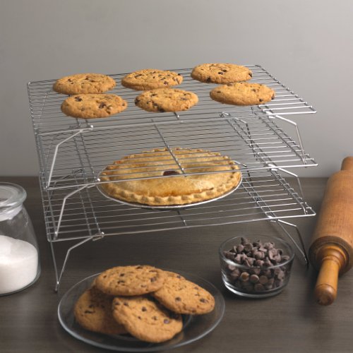 Studio : Fox Run Publisher : Fox Run Binding : Kitchen Product Description Whether you've got layers of cake or a big batch of cookies, these sturdy cooling racks will keep your baked treats high and dry. This system of three racks, each with collapsible legs, features horizontal cooling wires spaced equally apart. Each rack can be used individually, but they are easily stacked by moving the legs into standing position and nest the small rounded feet inside the lower rack's grid area. 0