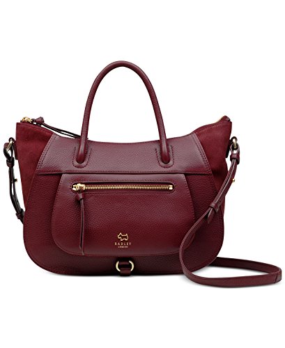 Product Description Radley London's spacious multiway satchel displays a scooped shape that mixes leather and suede for cool '70s aesthetic. Carry it by the long strap or grab-and-go handles. Medium sized bag; 12"W x 8-4/10"H x 4"D 4-4/10"L double handles; 23-2/10"L adjustable strap Zip closure Gold-tone exterior hardware, logo, hanging dog charm, buckle detail, winged sides, 1 front zip pocket 1 back slip pocket 1 interior zip pocket 2 slip pockets 1.93 lbs approximate weight Grainy leather; trim: suede 0
