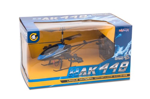 - Feature : Electric Powered, 4 Channel, Radio Control, Ultra Light Alloy Metal Body, Coaxial Rotor, Detailed Paint Job / Indoor/outdoor copter flies up to 300 feet / Length: 16" Width: 8.3" Height: 6.5" Product weight: 0.65 lbs. Main Rotor Diameter 13.5". Controls: forward / backward / up / down / left / right Intelligent R/C System. Full Scale Remote Control. 360 Precise Directional Movement. Smooth hovering performance. / Package Contents: 1 x HAK448 Helicopter, 1 x 3.7V 700mah battery (built-in), 1 x Transmitter, 1 x Antenna, 1 x Wall charger, 1 x Screwdriver, 1 x Instructions Manual. REQUIRED: 6 x 1.5V AA alkaline batteries for the Transmitter (Remote Control) / Please Note: Do not leave the helicopter switched on when not in use.